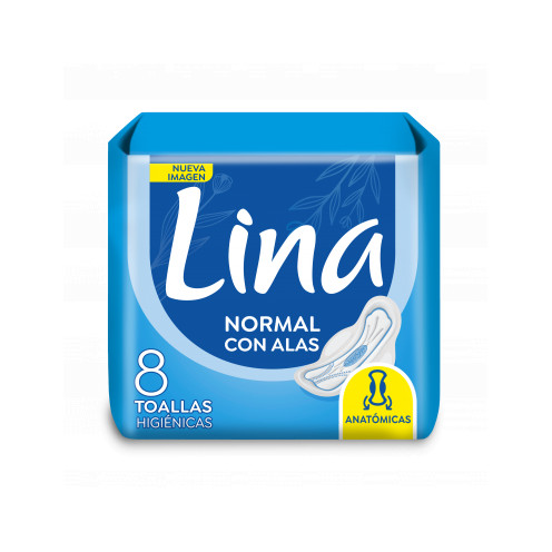 Lina toallitas femeninas anatómicas con alas súper absorbentes y con sistema antidesbordes x 8 unidades.