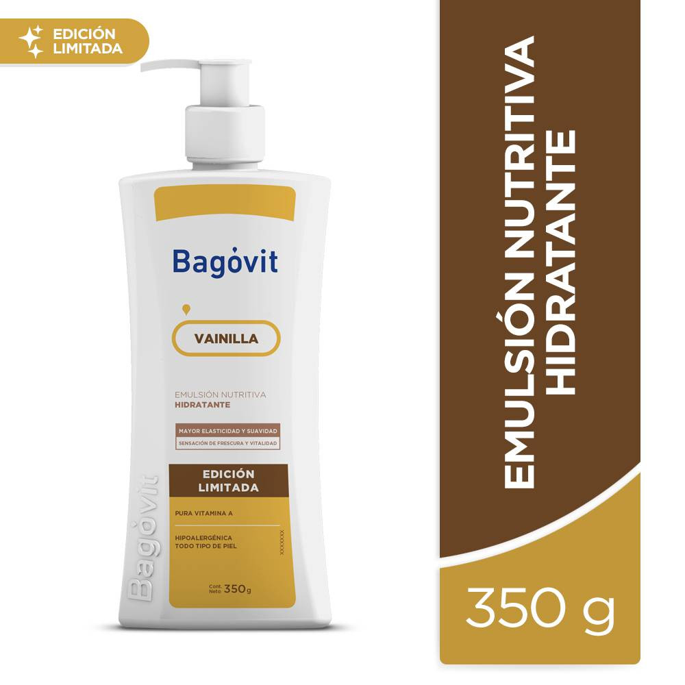 Bagovit emulsión nutritiva hidratante sweet vainilla, mayor elasticidad y suavidad, pura vitamina x 350 grs.