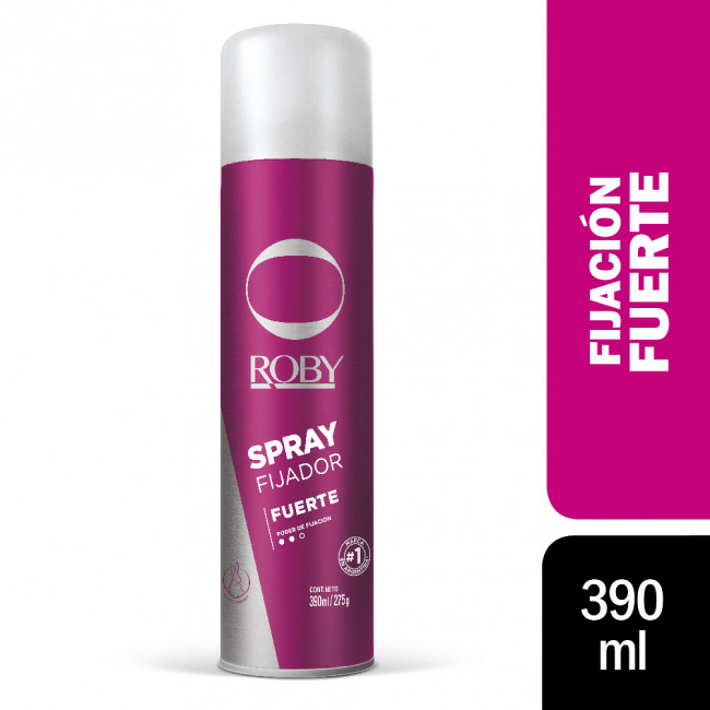 Roby by fijador fuerte, tu peinado dura por mucho más tiempo, secado rápido, no moja, reduce el frizz, brillo natural x390ml.