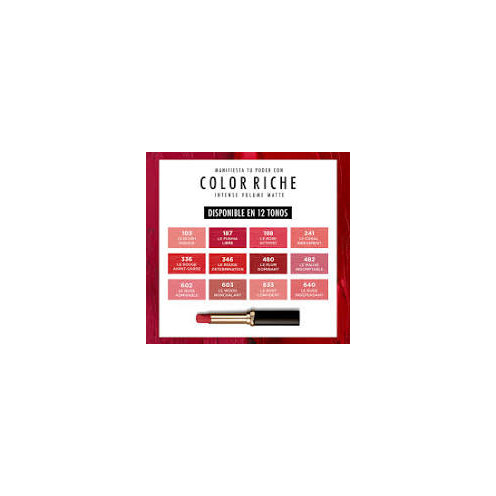 Loreal labial color riche intense matte, su fórmula con ácido hialurónico otorga volumen y 16 horas de duración matte rosel188